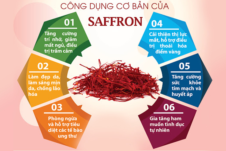Giảm các triệu chứng của tiền kinh nguyệt: Qua nghiên cứu và khảo sát trên thực tế, kết quả cho thấy saffron được công nhận trong vai trò hỗ trợ làm giảm các triệu chứng tiền kinh nguyệt, đau bụng, căng thẳng thần kinh, đau lưng, đau ngực,…